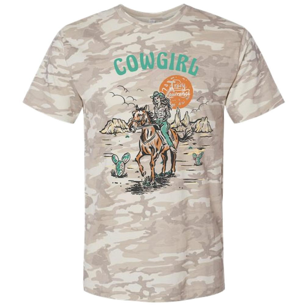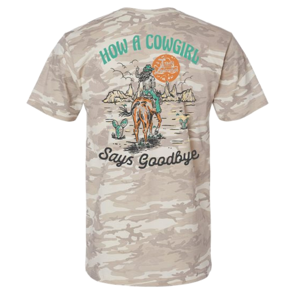 Unisex natural camo tee with cowgirl design on the front and How A Cowgirl Says Goodbye on the back.